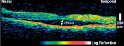 Eine Lochbildung in der Netzhautmitte (Makulaforamen) ist nur mit dem OCT darstellbar und messbar. Eine möglichst genaue Dokumentation der Ausmaße entzündlicher Veränderungen ist von großer Bedeutung, um frühzeitig eine Größenzunahme festzustellen.