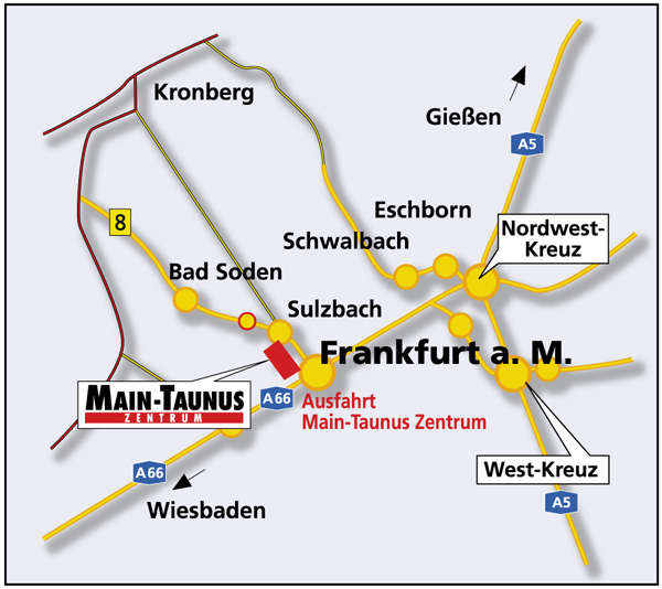 Sie erreichen uns über die A66 (Frankfurt - Wiesbaden) und die B8 (Bad Soden - Königstein Kronberg). Abfahrt: Main-Taunus-Zentrum